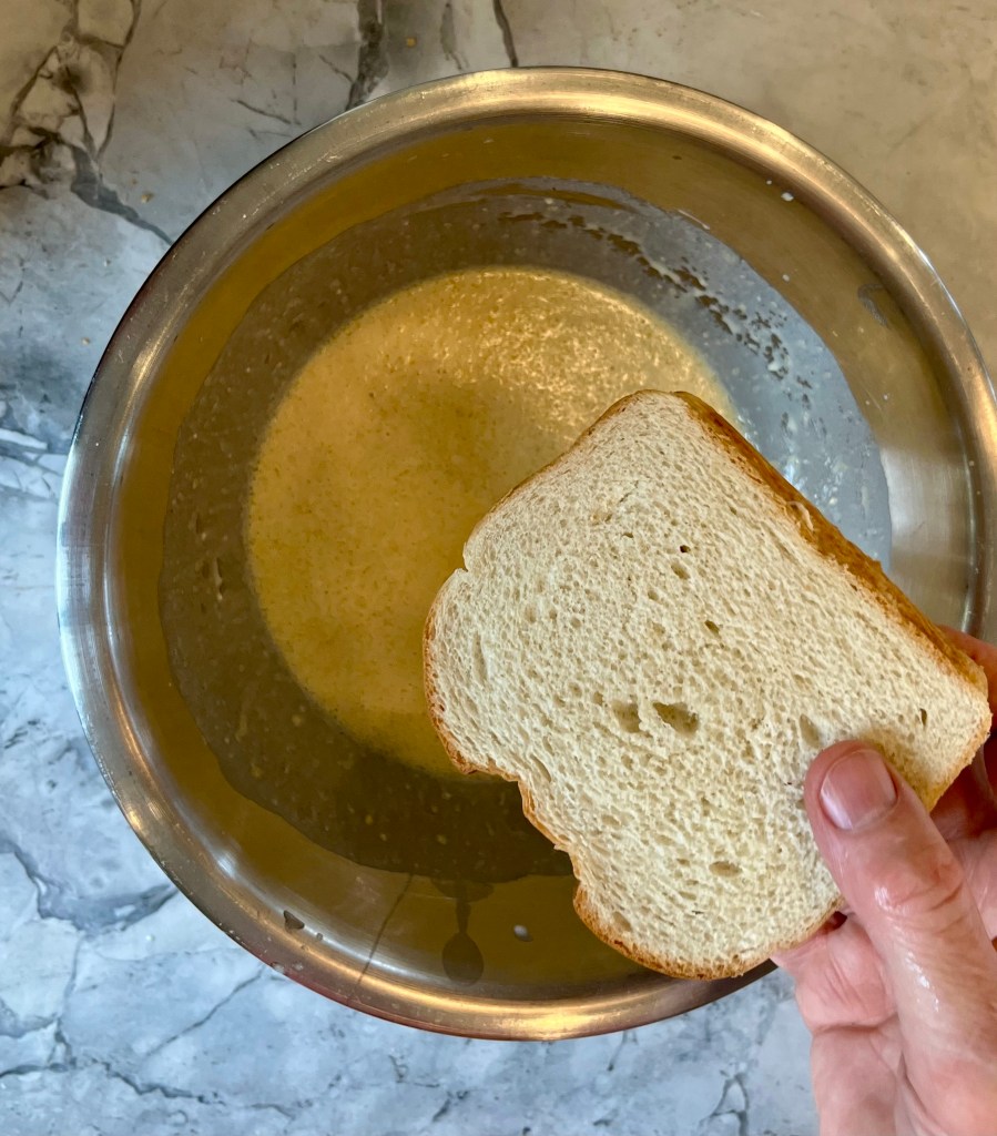 Sure, you could also use thick slices of brioche (after all, it is called “French” toast) or challah, but my trouble with these choices over Texas Toast, is they’re enriched with a significant amount of butter/oil, milk or eggs as compared to Texas Toast and there’s already a lot of that going on with French Toast to begin with- do you really need more? Plus, what sops up liquid better than white bread? Check out the bread section at your local grocer to see if you can find a loaf- I found one at mine, but would have never know it was there if I hadn’t asked the nice stock person.