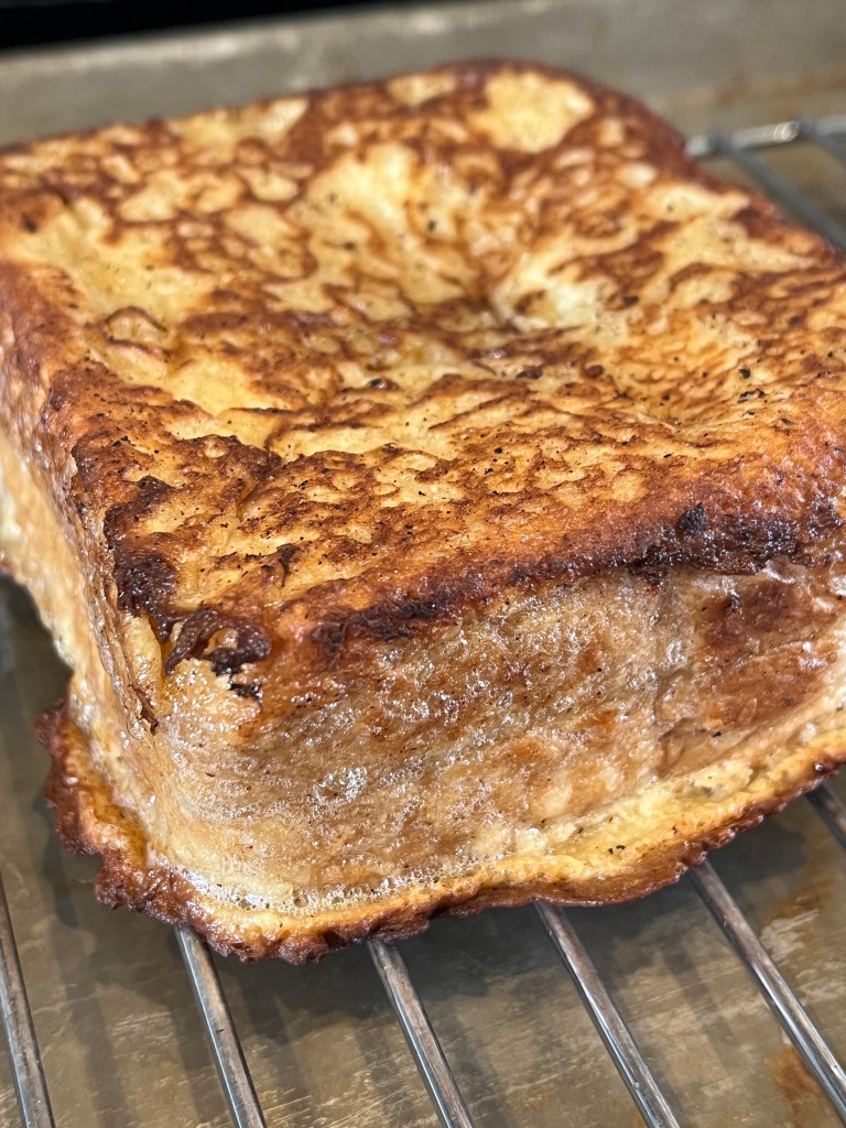 In fact, Texas Toast is simply really thick white bread, not that there’s anything wrong with that- in fact, I’d venture to say, for reasons noted below, it might be the perfect bread for French Toast. In spite of its white bread background, it nevertheless appears to have a colorful 1940s origin story, with several “Pig Stands” fighting to claim it as their own invention depending on who you want to believe. I choose to believe Kirby’s Pig Stand, who claimed not only to have given the world Texas Toast, but onion rings as well!