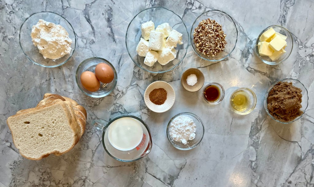 2. Cream Cheese Factory Filling. Add cream cheese, sugar, cinnamon, and vanilla to medium bowl and use a soft spatula or whisk to mix until smooth. Fold in chopped pecans. Evenly spread a thick layer of filling on each of 4 slices of bread, leaving an 1/2 inch border free of filling around the edges of each slice. Top with remaining 4 slices of toast to make the sandwich of your dreams. Feel free to do this the night before- cover and refrigerate until ready to cook.