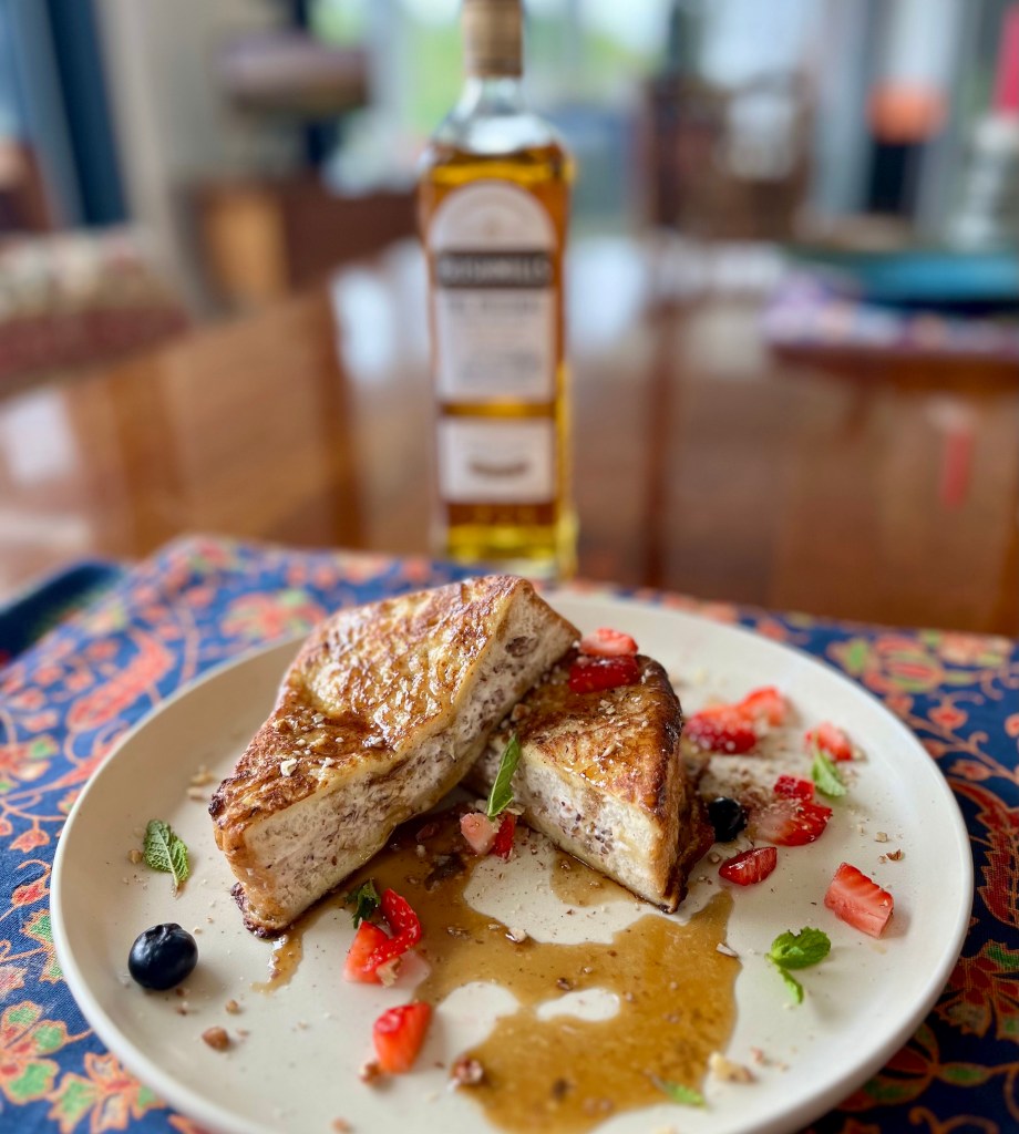 5. Dip and Cook. Get a large frying pan going over medium heat with a few tablespoons of butter or cooking oil. While pan is heating up, soak both sides of bread in egg mixture for 15-20 seconds and then add to pan. Cook in batches* if all toast won’t fit into one pan. Add toasts to pan and cook, adjusting heat as need to avoid burning, until down side is golden brown, then flip to cook other side, adding more butter or oil if needed, until golden brown- about 5-7 minutes a side. I also like to stand the toast on its sides to brown the four sides of the toast- a few minutes a side. Garnish toast as you wish and serve with Whiskey Sauce on the side.